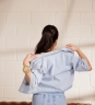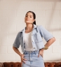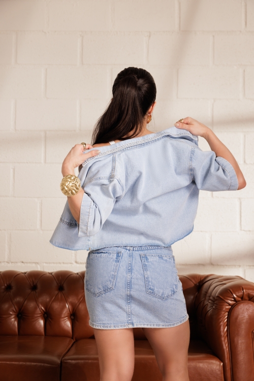 Mini saia jeans curtinha em lavagem clara e recorte frontal. Modelagem justa e moderna.