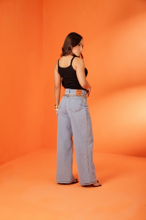 Calça Ísis, cós com passantes e fechamento frontal por botão e zíper. Possui bolsos frontais e posteriores, barra finalizada em bainha e modelagem ampla. Confeccionada em tecido 100% algodão.