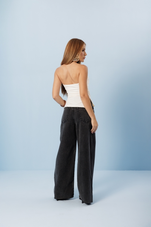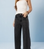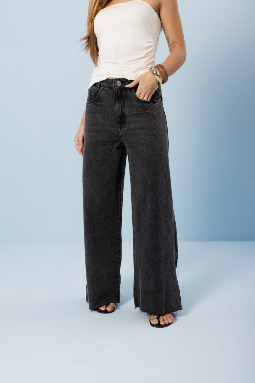 Calça Ana em 100% algodão, com modelagem ampla e caimento solto nas pernas. Lavagem estonada e fechamento por zíper e botão.