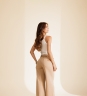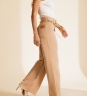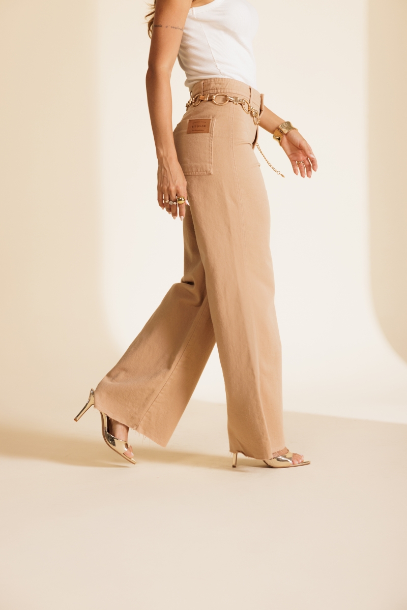 Calça jeans caqui de modelagem reta, com bolso traseiro quadrado e barra desfiada. Versátil e fácil de compor com diferentes estilos.