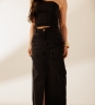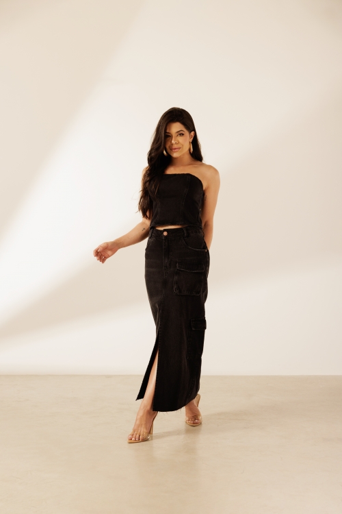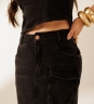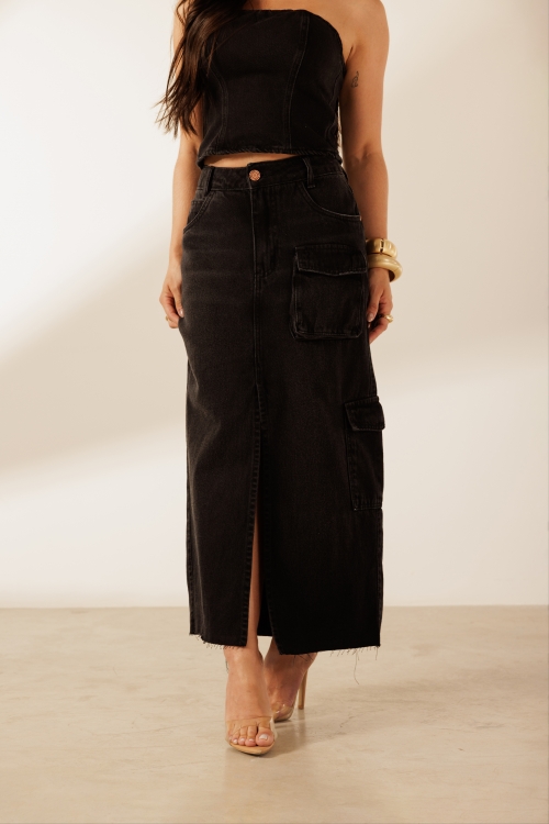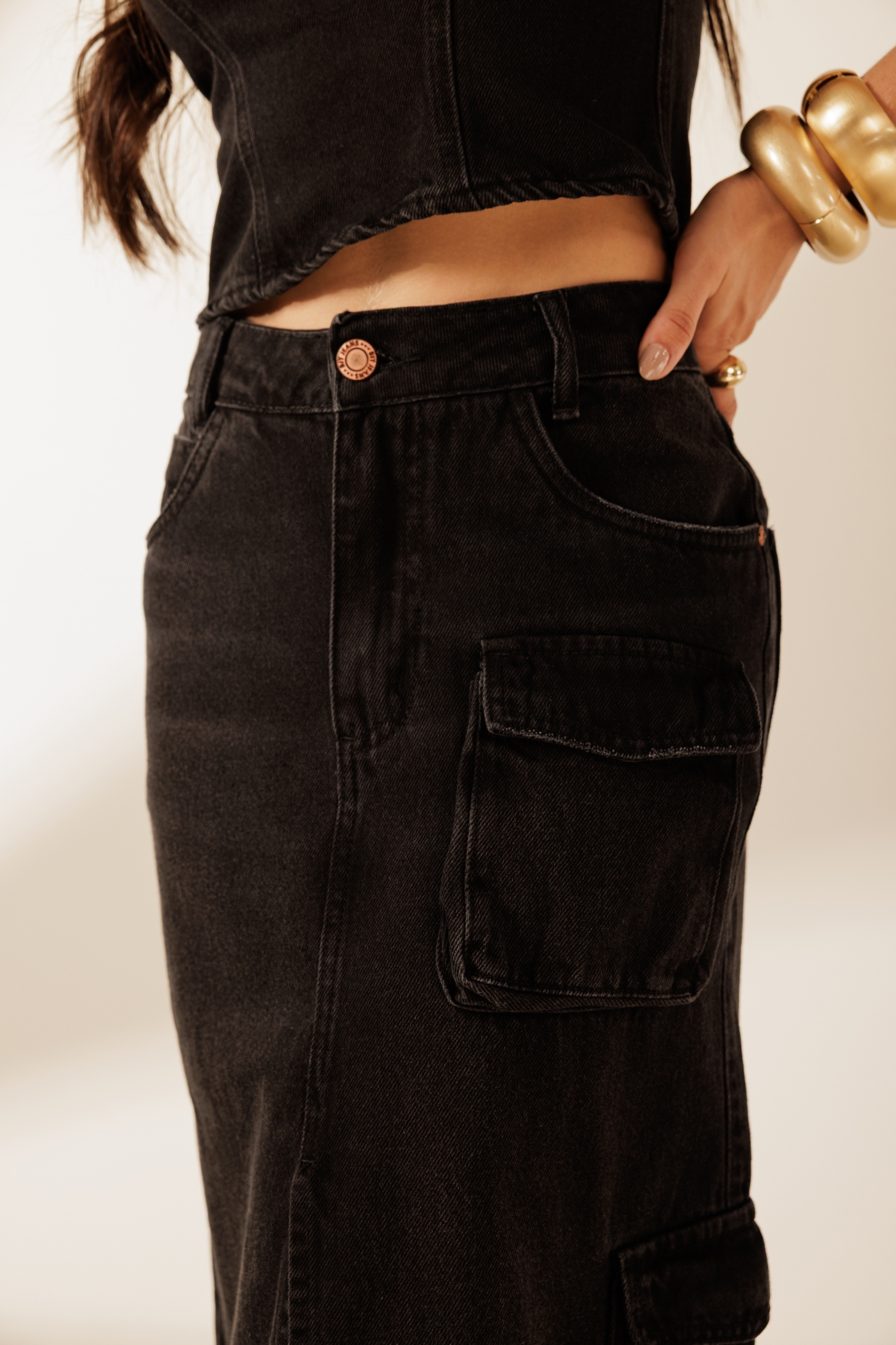 Saia Mid Cargo, com fenda frontal e bolsos laterais com aba. Confeccionada em tecido 100% algodão.