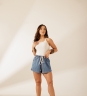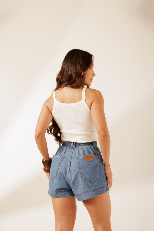Short Safira confeccionado em tecido leve de 65% algodão e 35% liocel. Possui cintura com elástico, amarração em cordão estilo rústico e bolsos frontais funcionais. Modelagem soltinha, com caimento confortável e barra levemente arredondada.