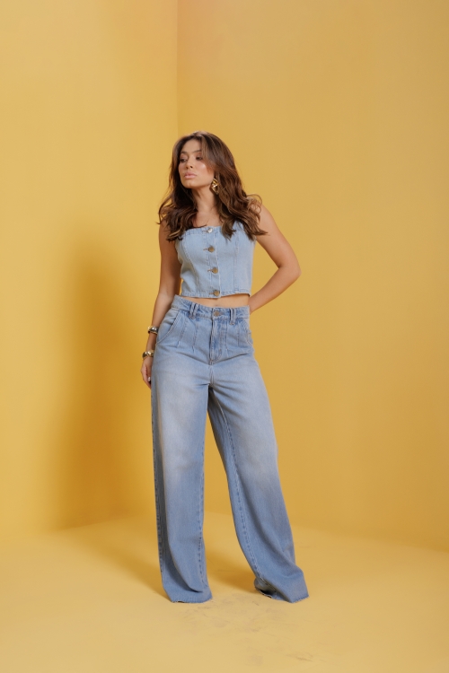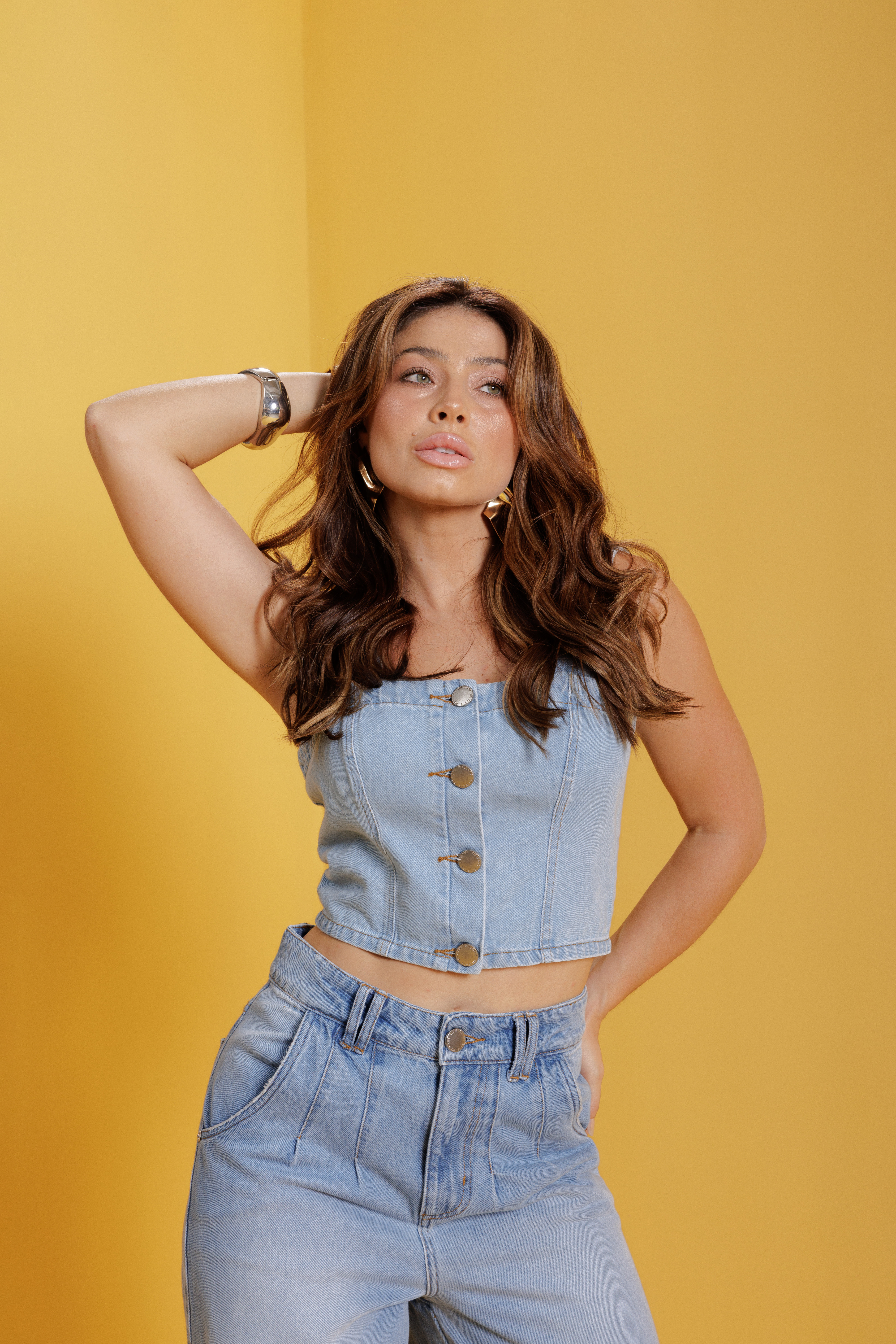Cropped Marília com botões frontais e recortes que valorizam a modelagem. Possui costas com elástico para melhor ajuste ao corpo. Confeccionado em tecido 100% algodão.
