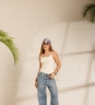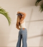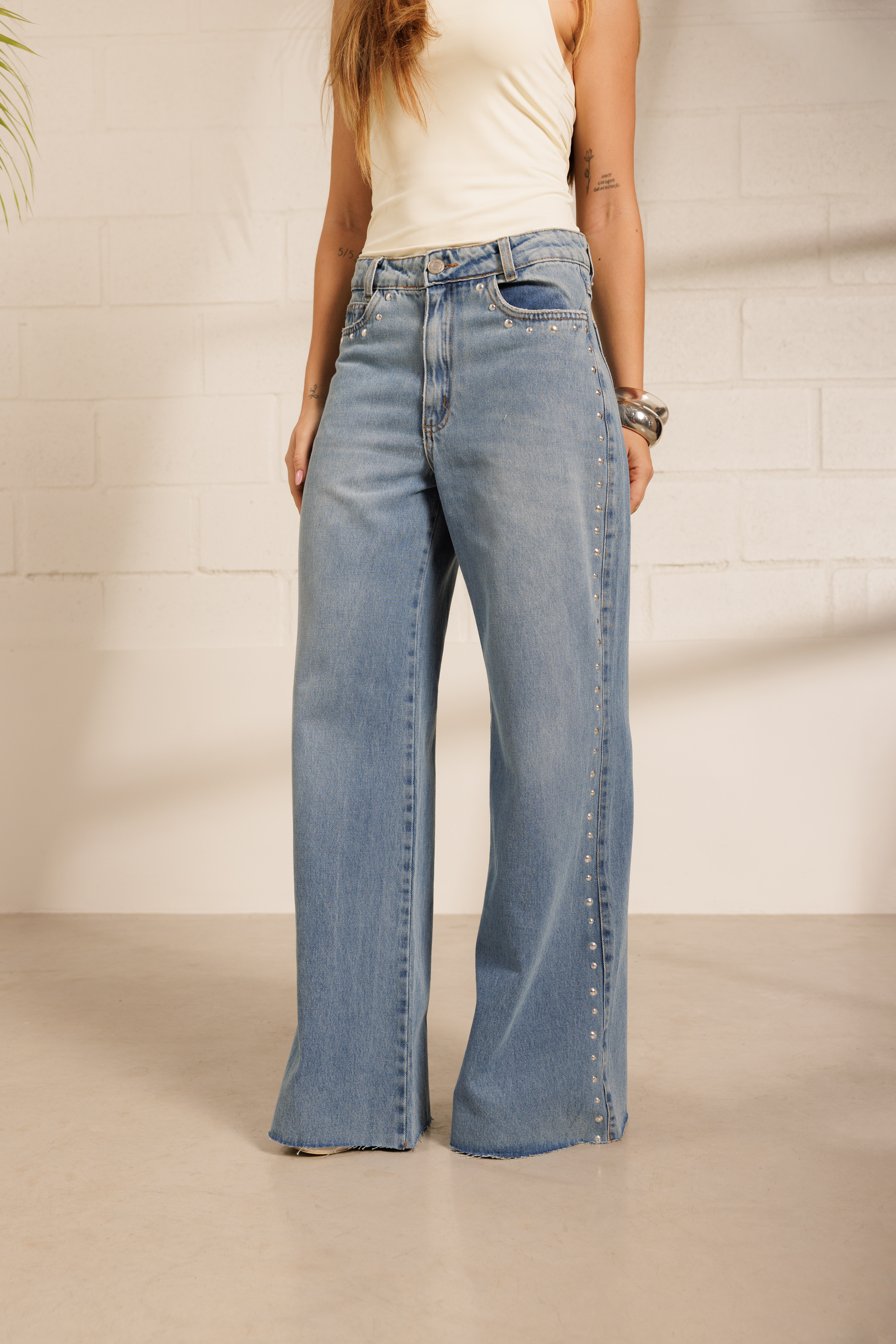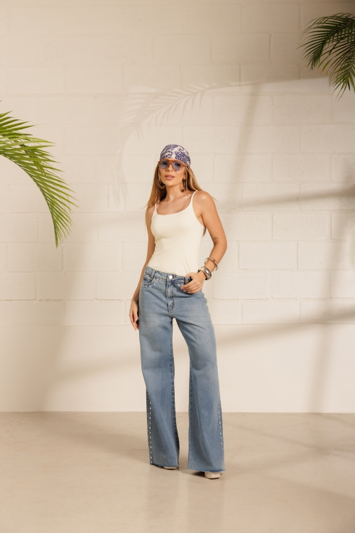 Calça Catarina, com modelagem larga e aplicação de tachinhas na parte frontal e nas laterais. Possui bolsos funcionais e barra levemente desfiada. Confeccionada em tecido 100% algodão.