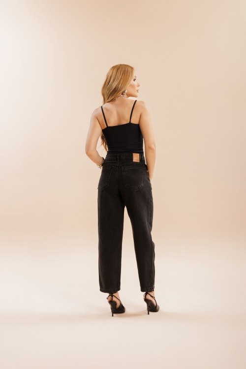 Calça Renata preta em jeans 100% algodão, com cintura alta e caimento mais reto ao longo da perna. Possui bolsos frontais e traseiros, passantes no cós e fechamento por botão e zíper.