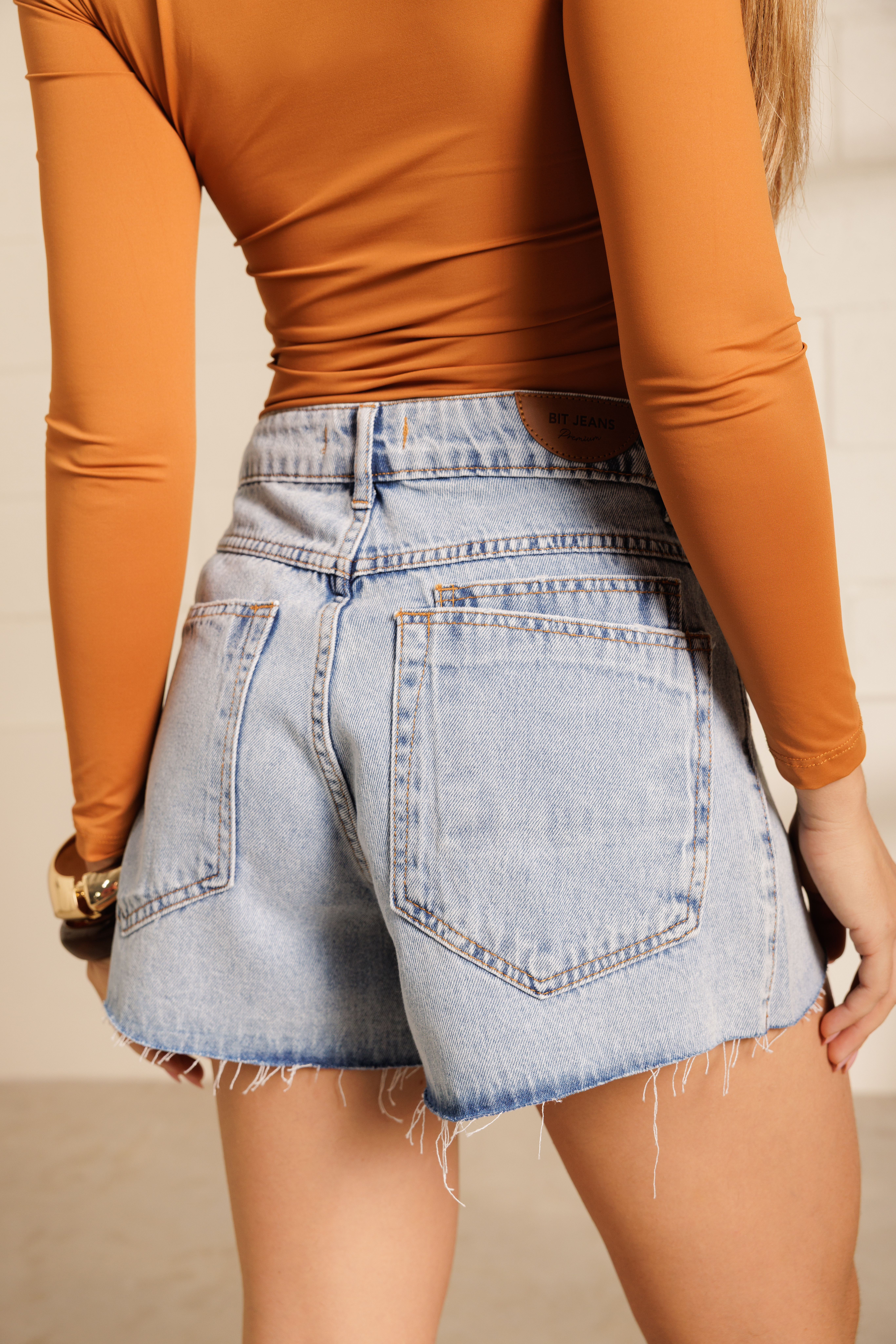 Short Amélia com recortes no mesmo tecido que desenham o visual e trazem um toque diferente à peça. Possui um bolso com bolso sobreposto nas costas, barra levemente desfiada e caimento firme em tecido 100% algodão.