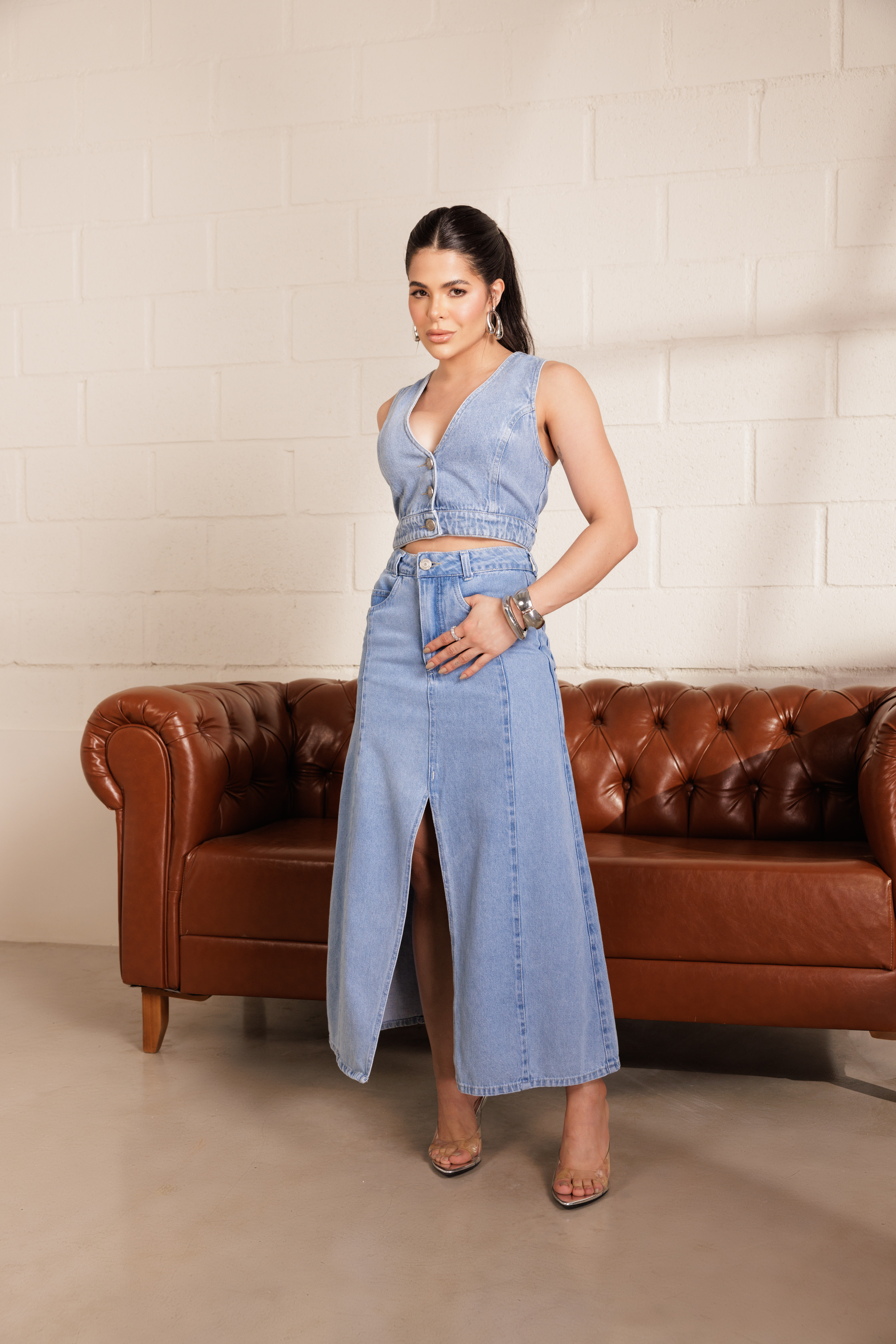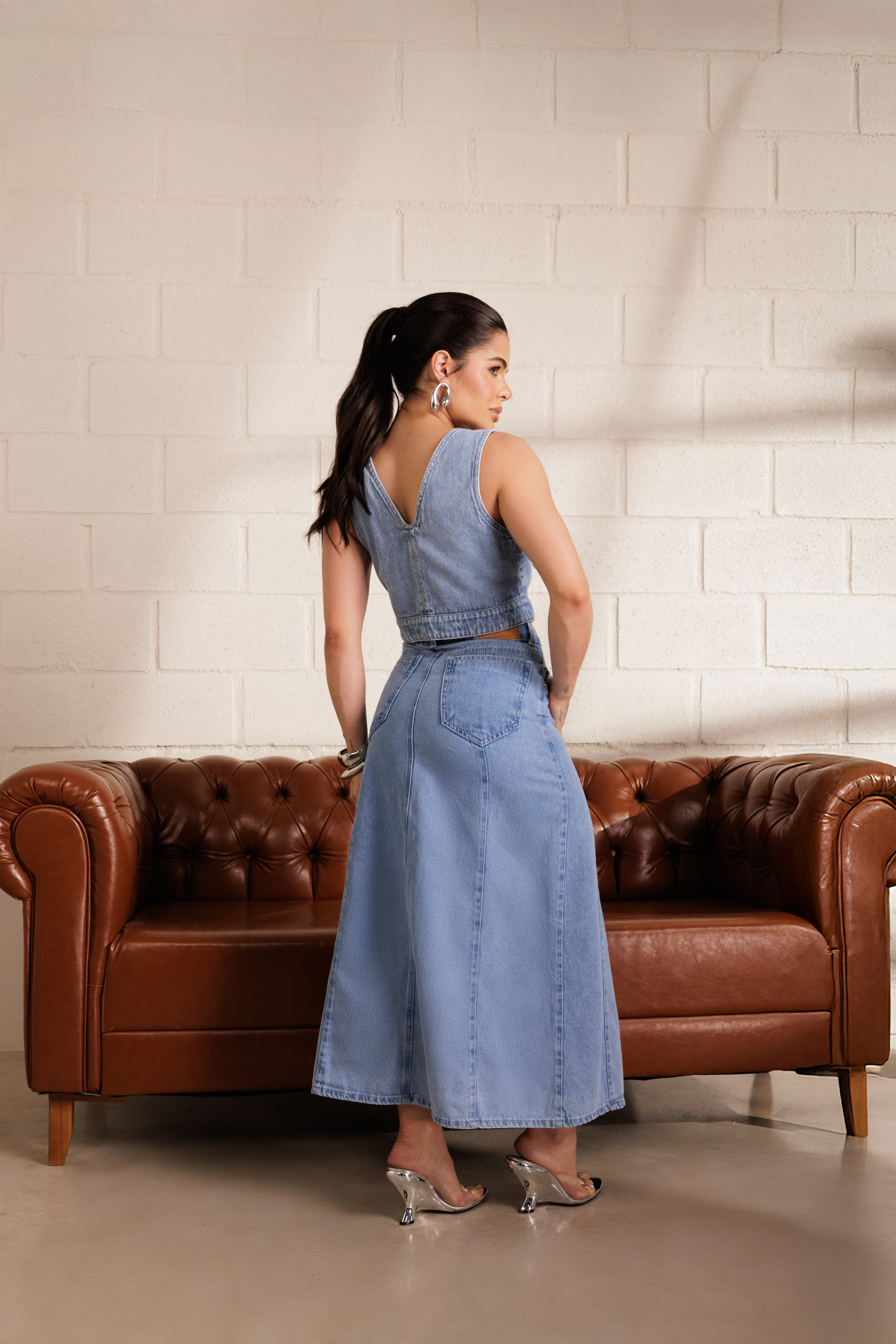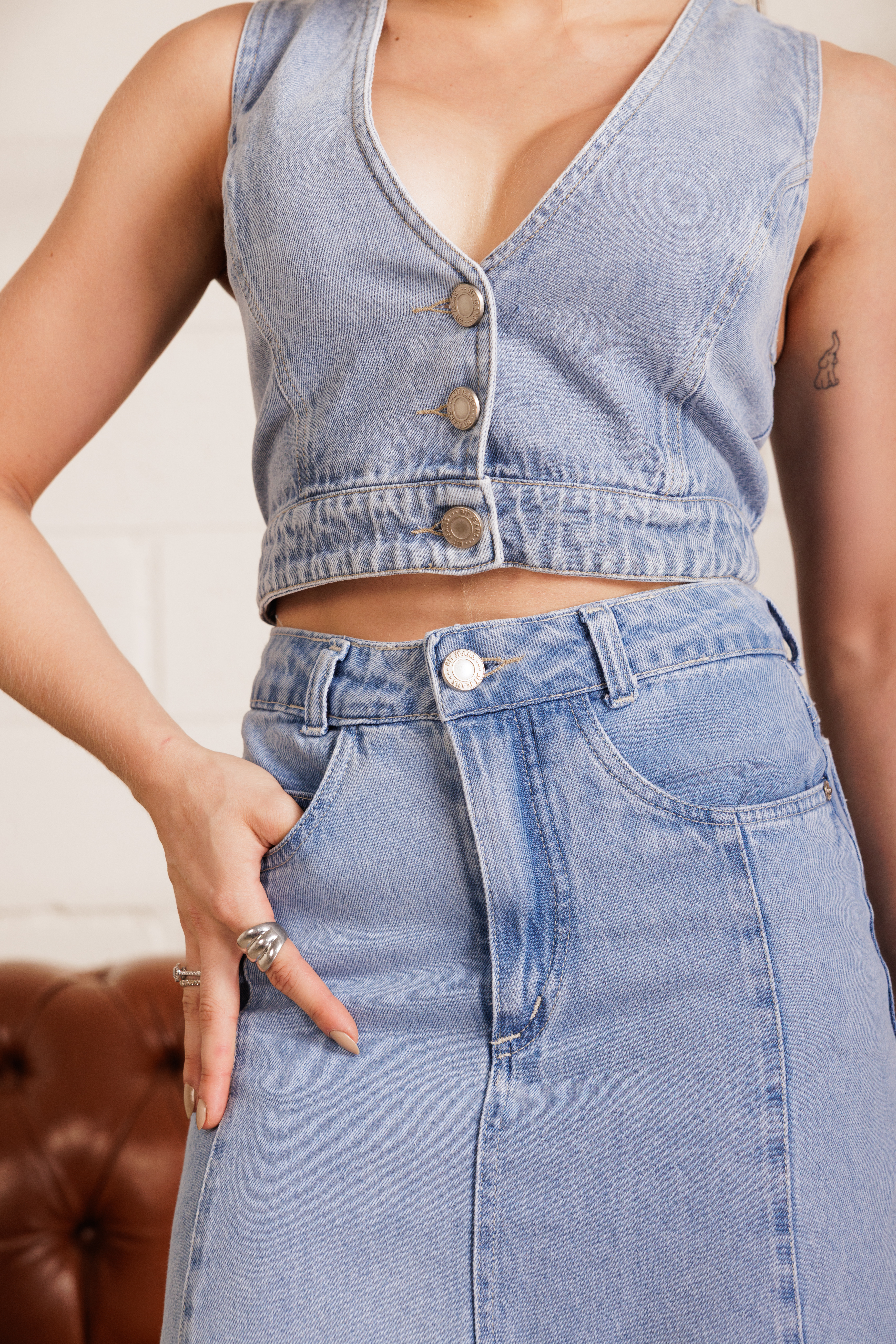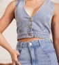 Cropped Button Bit com decote em V, modelagem ajustada e barra marcada. Possui fechamento frontal com três botões metálicos e costuras aparentes que destacam a peça. Um clássico do jeans em versão atualizada.
