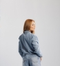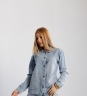 Camisa jeans de lavagem clara, manga longa com punho e botões frontais metálicos. Possui bolsos grandes aplicados na parte inferior.