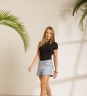 Body Sofia em poliamida com manguinhas curtas, gola fechada e modelagem justa ao corpo. Fechamento por botão de pressão, ideal pra montar looks práticos e estilosos.