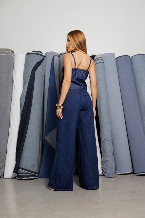 Blusa Candy em tecido jeans leve com alças finas, decote em V e detalhe de pregas no busto. Modelagem soltinha com recortes que valorizam a peça de forma moderna e casual.