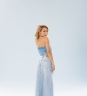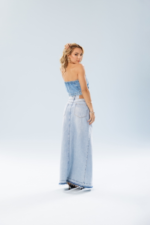 Saia Thais em 100% algodão, com fenda frontal e recortes que alongam a silhueta. Possui detalhe desfiado na barra, trazendo um toque despojado ao visual.