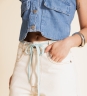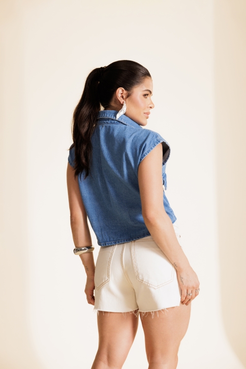 Short jeans off white com torçal azul contrastante na cintura, barra desfiada com acabamento chuleado e recorte levemente asa delta. Possui bolso relógio e costura aparente em tom caramelo.